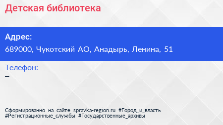 Детская библиотека по адресу 689000, Чукотский АО, Анадырь, Ленина, 51 в дальнейшем Организация, размещена в следующих категориях: