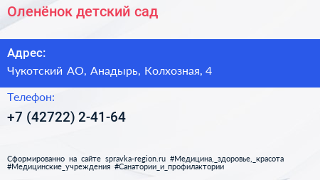 Оленёнок, детский сад по адресу Чукотский АО, Анадырь, Колхозная, 4 в дальнейшем Организация, размещена в следующих категориях: