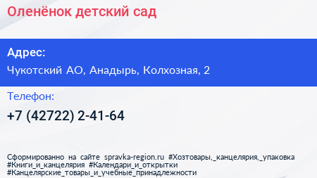 Оленёнок, детский сад по адресу Чукотский АО, Анадырь, Колхозная, 2 в дальнейшем Организация, размещена в следующих категориях: