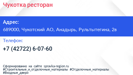 Чукотка, ресторан по адресу 689000, Чукотский АО, Анадырь, Рультытегина, 2в в дальнейшем Организация, размещена в следующих категориях: