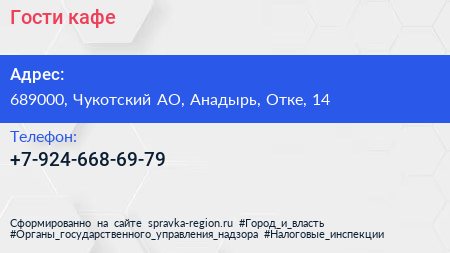 Гости, кафе по адресу 689000, Чукотский АО, Анадырь, Отке, 14 в дальнейшем Организация, размещена в следующих категориях: