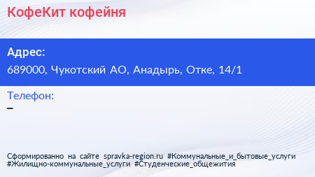 КофеКит, кофейня по адресу 689000, Чукотский АО, Анадырь, Отке, 14/1 в дальнейшем Организация, размещена в следующих категориях: