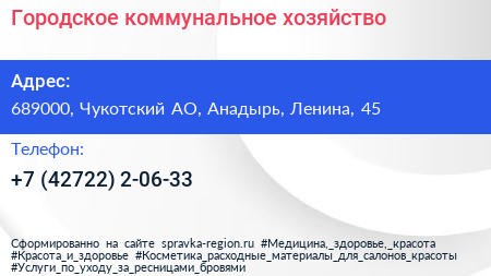 Городское коммунальное хозяйство по адресу 689000, Чукотский АО, Анадырь, Ленина, 45 в дальнейшем Организация, размещена в следующих категориях: