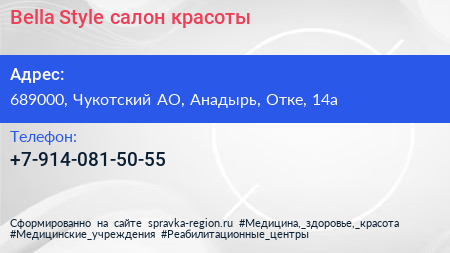Bella Style, салон красоты по адресу 689000, Чукотский АО, Анадырь, Отке, 14а в дальнейшем Организация, размещена в следующих категориях: