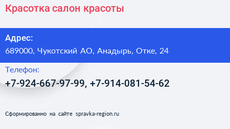 Красотка, салон красоты по адресу 689000, Чукотский АО, Анадырь, Отке, 24 в дальнейшем Организация, размещена в следующих категориях: