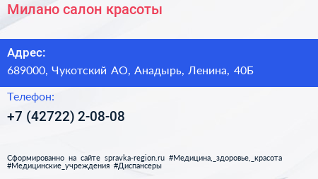 Милано, салон красоты по адресу 689000, Чукотский АО, Анадырь, Ленина, 40Б в дальнейшем Организация, размещена в следующих категориях:
