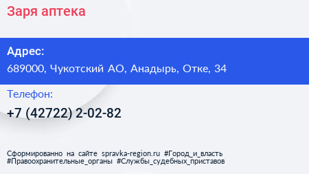 Заря, аптека по адресу 689000, Чукотский АО, Анадырь, Отке, 34 в дальнейшем Организация, размещена в следующих категориях:
