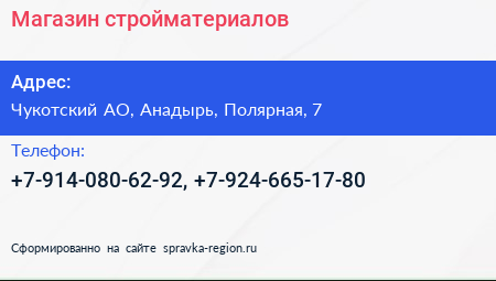 Магазин стройматериалов по адресу Чукотский АО, Анадырь, Полярная, 7 в дальнейшем Организация, размещена в следующих категориях: