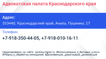 Адвокатская палата Краснодарского края по адресу 353440, Краснодарский край, Анапа, Пушкина, 17 в дальнейшем Организация, размещена в следующих категориях: