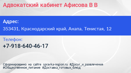 Адвокатский кабинет Афисова В.В. по адресу 353431, Краснодарский край, Анапа, Тенистая, 12 в дальнейшем Организация, размещена в следующих категориях: