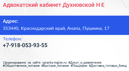 Адвокатский кабинет Духновской Н.Е. по адресу 353440, Краснодарский край, Анапа, Пушкина, 17 в дальнейшем Организация, размещена в следующих категориях: