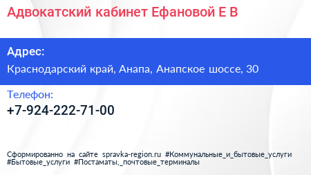 Адвокатский кабинет Ефановой Е.В. по адресу Краснодарский край, Анапа, Анапское шоссе, 30 в дальнейшем Организация, размещена в следующих категориях: