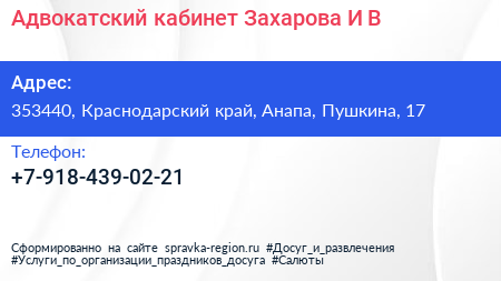 Адвокатский кабинет Захарова И.В. по адресу 353440, Краснодарский край, Анапа, Пушкина, 17 в дальнейшем Организация, размещена в следующих категориях: