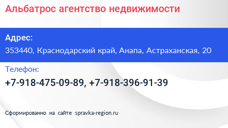 Альбатрос, агентство недвижимости по адресу 353440, Краснодарский край, Анапа, Астраханская, 20 в дальнейшем Организация, размещена в следующих категориях: