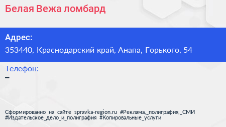 Белая Вежа, ломбард по адресу 353440, Краснодарский край, Анапа, Горького, 54 в дальнейшем Организация, размещена в следующих категориях: