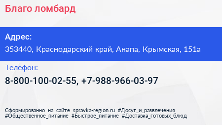 Благо, ломбард по адресу 353440, Краснодарский край, Анапа, Крымская, 151а в дальнейшем Организация, размещена в следующих категориях: