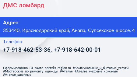 ДМС, ломбард по адресу 353440, Краснодарский край, Анапа, Супсехское шоссе, 4 в дальнейшем Организация, размещена в следующих категориях: