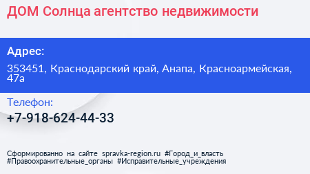 ДОМ Солнца, агентство недвижимости по адресу 353451, Краснодарский край, Анапа, Красноармейская, 47а в дальнейшем Организация, размещена в следующих категориях: