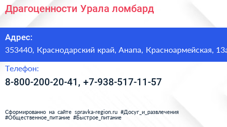 Драгоценности Урала, ломбард по адресу 353440, Краснодарский край, Анапа, Красноармейская, 13а в дальнейшем Организация, размещена в следующих категориях: