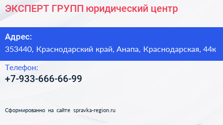 ЭКСПЕРТ ГРУПП, юридический центр по адресу 353440, Краснодарский край, Анапа, Краснодарская, 44к в дальнейшем Организация, размещена в следующих категориях: