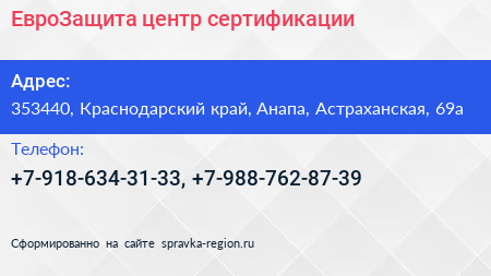 ЕвроЗащита, центр сертификации по адресу 353440, Краснодарский край, Анапа, Астраханская, 69а в дальнейшем Организация, размещена в следующих категориях: