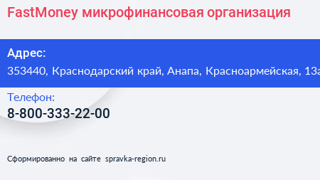 FastMoney, микрофинансовая организация по адресу 353440, Краснодарский край, Анапа, Красноармейская, 13а в дальнейшем Организация, размещена в следующих категориях: