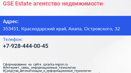 GSE Estate, агентство недвижимости по адресу 353451, Краснодарский край, Анапа, Островского, 32 в дальнейшем Организация, размещена в следующих категориях: