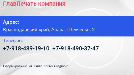 ГлавПечать, компания по адресу Краснодарский край, Анапа, Шевченко, 2 в дальнейшем Организация, размещена в следующих категориях: