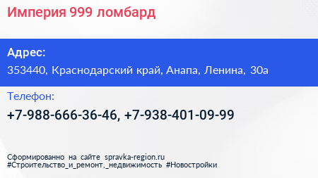 Империя 999, ломбард по адресу 353440, Краснодарский край, Анапа, Ленина, 30а в дальнейшем Организация, размещена в следующих категориях: