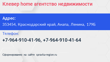 Клевер home, агентство недвижимости по адресу 353454, Краснодарский край, Анапа, Ленина, 179Б в дальнейшем Организация, размещена в следующих категориях: