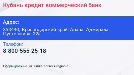 Кубань кредит, коммерческий банк по адресу 353440, Краснодарский край, Анапа, Адмирала Пустошкина, 22а в дальнейшем Организация, размещена в следующих категориях: