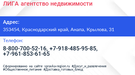ЛИГА, агентство недвижимости по адресу 353454, Краснодарский край, Анапа, Крылова, 31 в дальнейшем Организация, размещена в следующих категориях:
