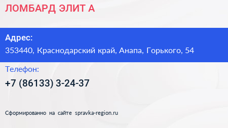 ЛОМБАРД ЭЛИТ-А по адресу 353440, Краснодарский край, Анапа, Горького, 54 в дальнейшем Организация, размещена в следующих категориях: