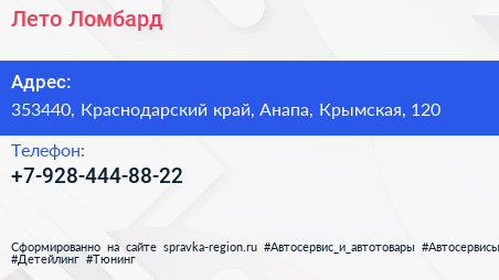 Лето Ломбард по адресу 353440, Краснодарский край, Анапа, Крымская, 120 в дальнейшем Организация, размещена в следующих категориях: