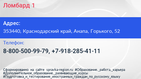 Ломбард №1 по адресу 353440, Краснодарский край, Анапа, Горького, 52 в дальнейшем Организация, размещена в следующих категориях: