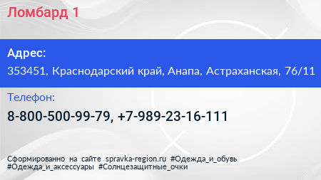 Ломбард №1 по адресу 353451, Краснодарский край, Анапа, Астраханская, 76/11 в дальнейшем Организация, размещена в следующих категориях: