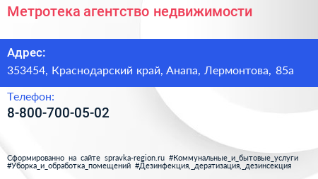 Метротека, агентство недвижимости по адресу 353454, Краснодарский край, Анапа, Лермонтова, 85а в дальнейшем Организация, размещена в следующих категориях: