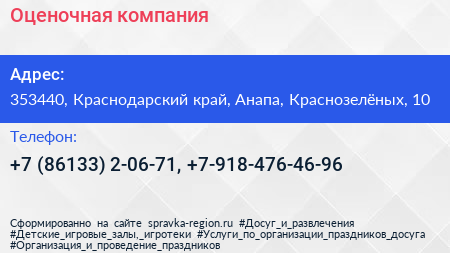 Оценочная компания по адресу 353440, Краснодарский край, Анапа, Краснозелёных, 10 в дальнейшем Организация, размещена в следующих категориях: