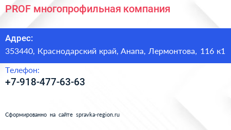 PROF, многопрофильная компания по адресу 353440, Краснодарский край, Анапа, Лермонтова, 116 к1 в дальнейшем Организация, размещена в следующих категориях: