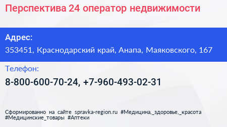 Перспектива 24, оператор недвижимости по адресу 353451, Краснодарский край, Анапа, Маяковского, 167 в дальнейшем Организация, размещена в следующих категориях:
