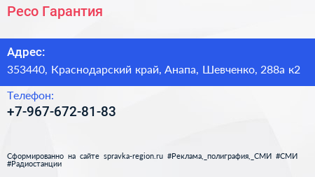 Ресо-Гарантия по адресу 353440, Краснодарский край, Анапа, Шевченко, 288а к2 в дальнейшем Организация, размещена в следующих категориях: