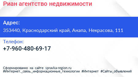Риан, агентство недвижимости по адресу 353440, Краснодарский край, Анапа, Некрасова, 111 в дальнейшем Организация, размещена в следующих категориях: