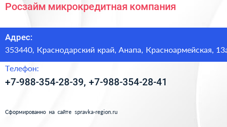 Росзайм, микрокредитная компания по адресу 353440, Краснодарский край, Анапа, Красноармейская, 13а в дальнейшем Организация, размещена в следующих категориях: