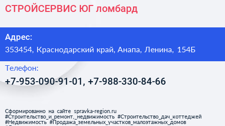 СТРОЙСЕРВИС-ЮГ, ломбард по адресу 353454, Краснодарский край, Анапа, Ленина, 154Б в дальнейшем Организация, размещена в следующих категориях: