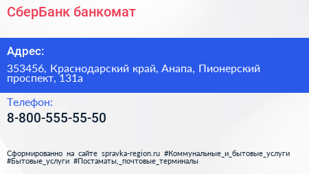 СберБанк, банкомат по адресу 353456, Краснодарский край, Анапа, Пионерский проспект, 131а в дальнейшем Организация, размещена в следующих категориях: