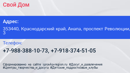 Свой Дом по адресу 353440, Краснодарский край, Анапа, проспект Революции, 3 в дальнейшем Организация, размещена в следующих категориях: