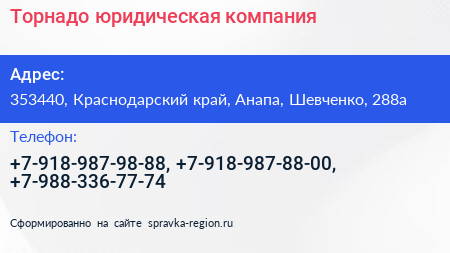 Торнадо, юридическая компания по адресу 353440, Краснодарский край, Анапа, Шевченко, 288а в дальнейшем Организация, размещена в следующих категориях: