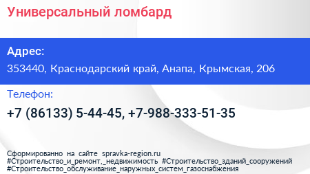 Универсальный, ломбард по адресу 353440, Краснодарский край, Анапа, Крымская, 206 в дальнейшем Организация, размещена в следующих категориях: