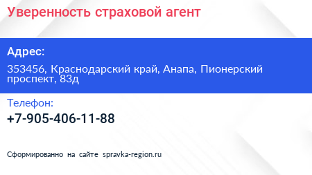 Уверенность, страховой агент по адресу 353456, Краснодарский край, Анапа, Пионерский проспект, 83д в дальнейшем Организация, размещена в следующих категориях:
