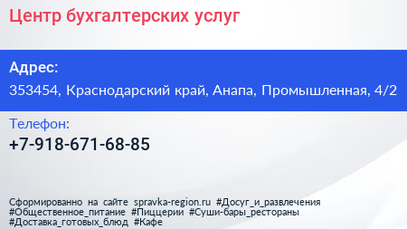 Центр бухгалтерских услуг по адресу 353454, Краснодарский край, Анапа, Промышленная, 4/2 в дальнейшем Организация, размещена в следующих категориях: